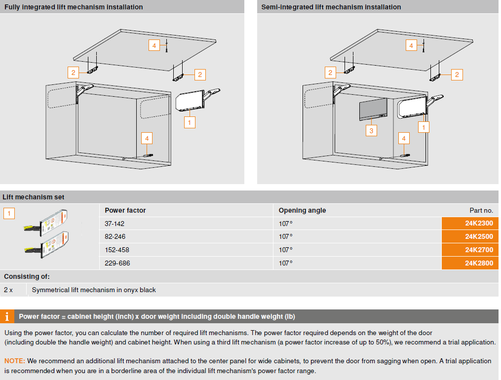 (including double the handle weight) and cabinet height. When using a third lift mechanism (a power factor increase of up to 50%), we recommend a trial application.