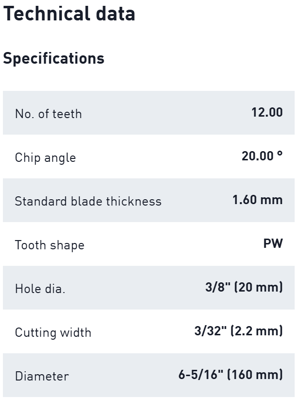 - 12 tooth; 2.2mm kerf; 20mm arbor; 20 deg hook angle; ATB