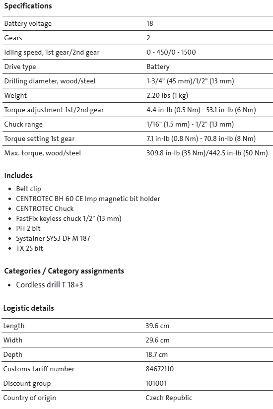CENTROTEC Chuck; CENTROTEC BH 60 CE Imp magnetic bit holder; FastFix keyless chuck 1/2" (13 mm); PH 2 bit; TX 25 bit; Belt clip; Systainer SYS3 DF M 187