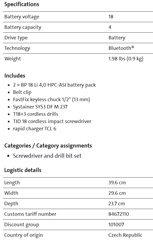 TID 18 cordless impact screwdriver; T18+3 cordless drills; 2 x BP 18 Li 4,0 HPC-ASI battery pack; rapid charger TCL 6; FastFix keyless chuck 1/2" (13 mm); Belt clip; Systainer SYS3 DF M 237