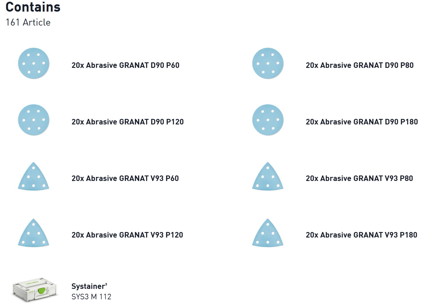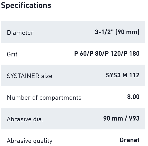 The abrasives Systainer is the perfect addition to your sander. With its wide range of grit sizes, it offers a great way to get started with GRANAT abrasives. 20x GRANAT sanding discs in grits sizes from P60 to P180 are always within reach. The abrasives Systainer is organized by grit size. Each compartment is designed for easy organization, allowing you to find the right grit size in seconds. Easy to refill, helping to ensure you always have an ample supply of the grit size you need. The Systainer offers optimal protection for your abrasives against dust, water spray, and errant damage. It also allows you to easily transport your abrasives and can be connected to other Systainers – making a very professional impression on your customers. From the workshop to the job site, the abrasives Systainer keeps you ready for anything during your work day. Thanks to the tried-and-tested T-LOC operating element, it can be closed, opened and connected with ease. The Systainers are compatible with each other and can be connected to all previous Systainer generations as well as many machines and accessories. GRANAT – the perfect choice for sanding.