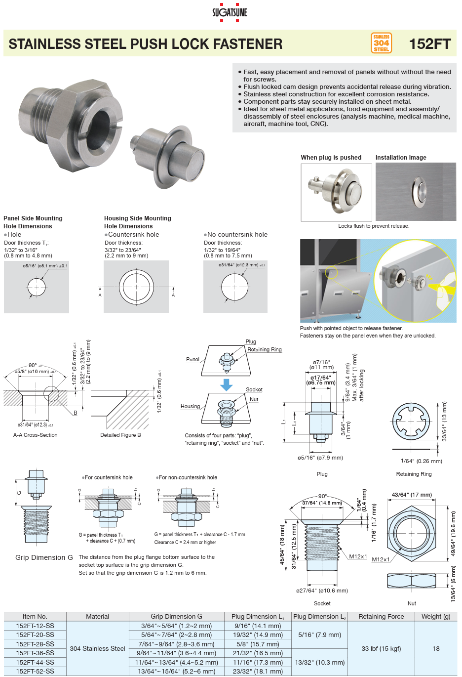 Sugatsune 152FT STAINLESS STEEL PUSH LOCK FASTENER Several Grip Dimensions Available