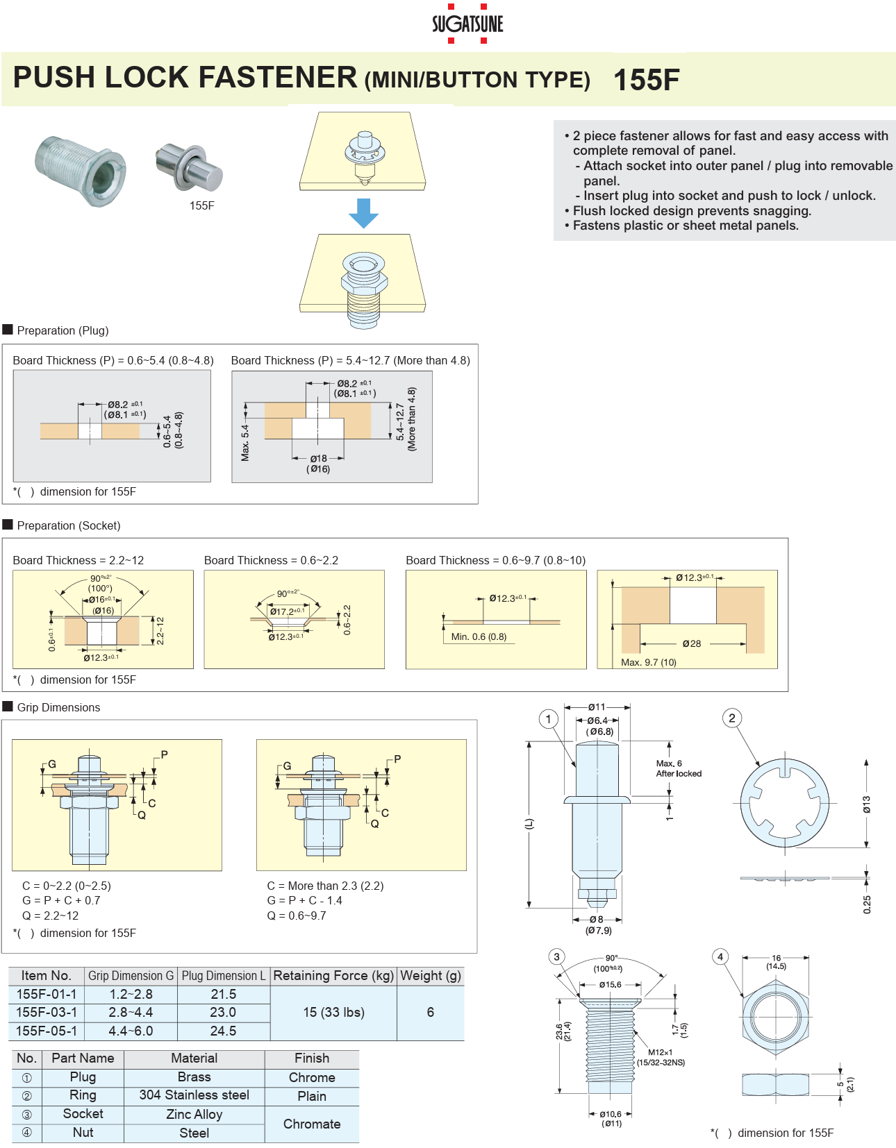 Sugatsune 155F PUSH LOCK FASTENER (MINI/FLUSH TYPE) Brass Plus - Zinc Socket - Stainless Steel Ring