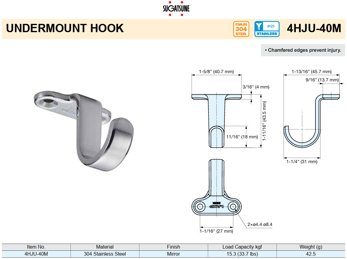 Sugatsune 4HJU-40M UNDERMOUNT HOOK
