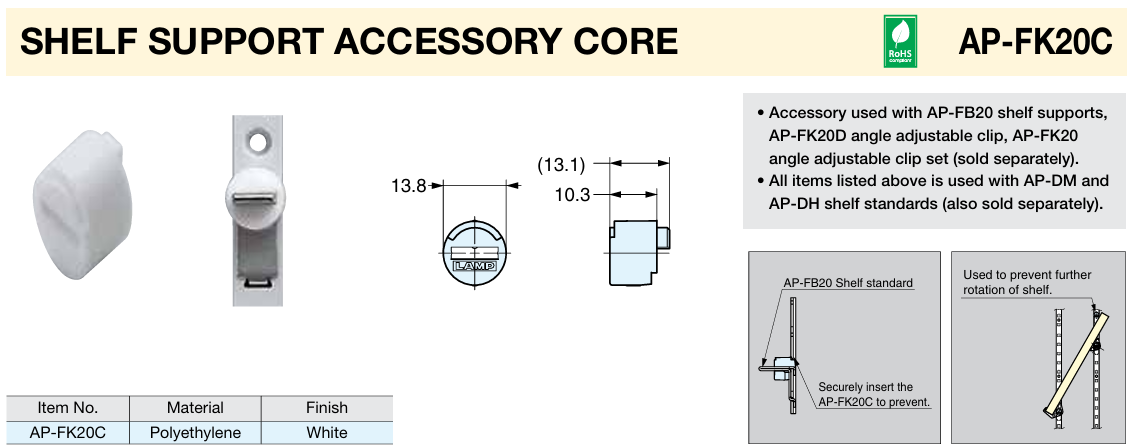 • Accessory used with AP-FB20 shelf supports, AP-FK20D angle adjustable clip, AP-FK20 angle adjustable clip set (sold separately).