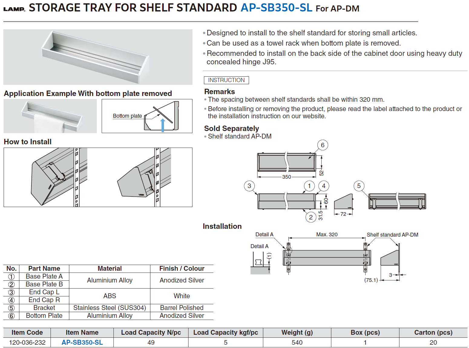 Sugatsune AP-SB350-SL ALUMINUM ALLOY STORAGE TRAY FOR SHELF STANDARD AP-DM