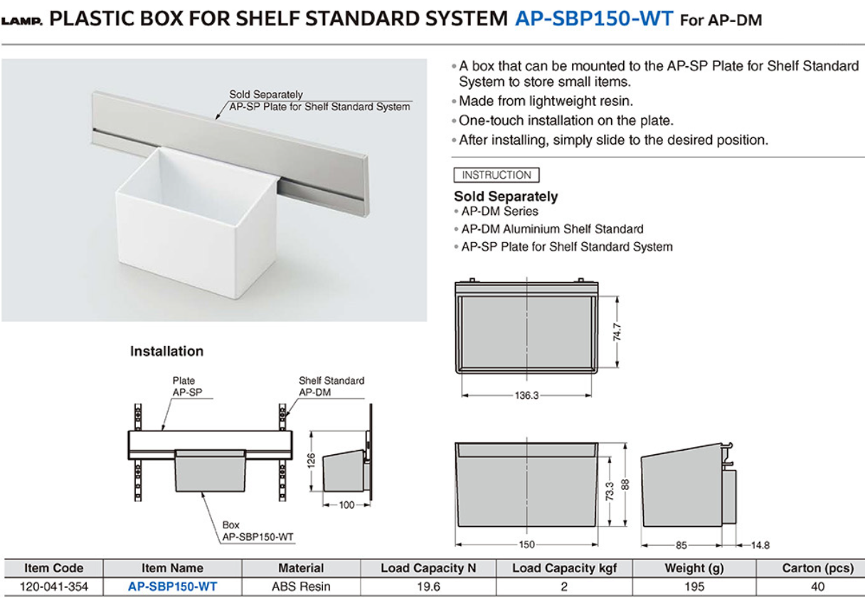 A box that can be mounted to the AP-SP Plate for Shelf Standard System to store small items.