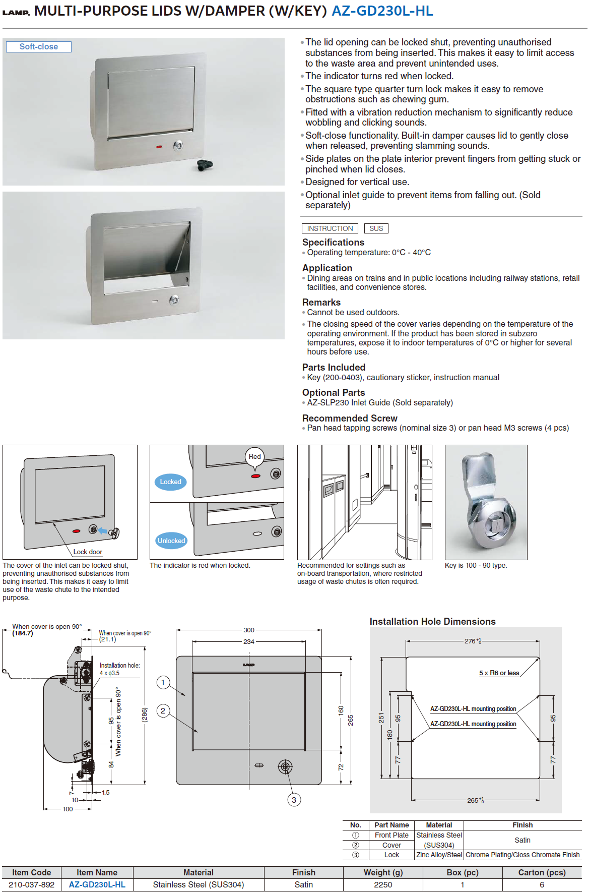 Sugatsune AZ-GD230L-HL LOCKING MULTI-PURPOSE LID WITH DAMPER