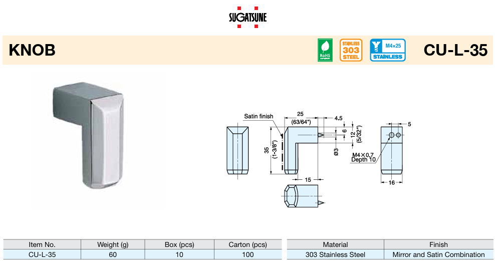 Sugatsune CU-L-35 3 303 Stainless Steel Finger Pull/Knob