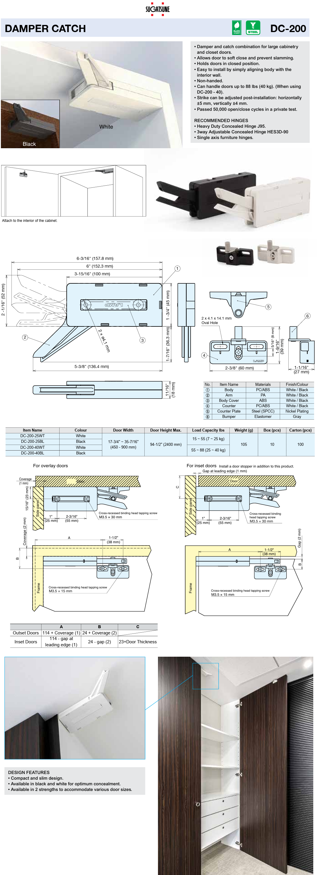 Sugatsune DC-200 DAMPER CATCH 2 Load Capicity Options