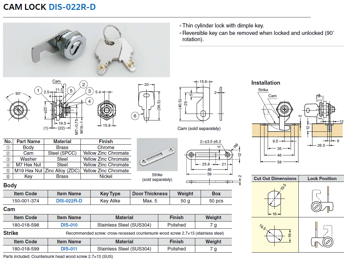 • Reversible key can be removed when locked and unlocked (90˚