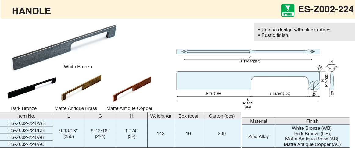 Sugatsune ES-Z002-224 Series Sleek Design Pulls 8-13/16" (224mm) Center to Centers