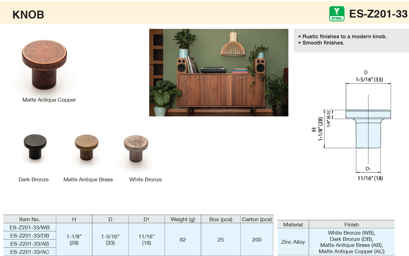 • Rustic finishes to a modern knob.