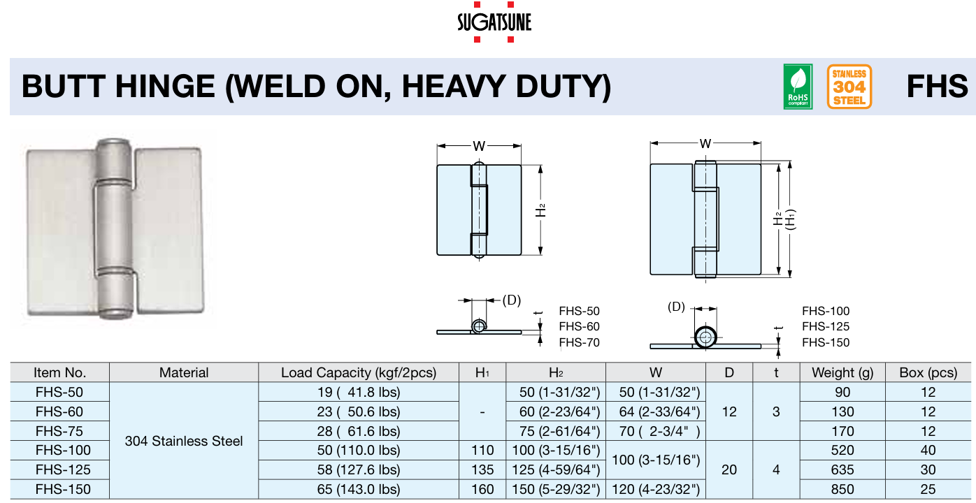 Sugatsune FHS Series BUTT BUTT HINGES WELD ON HEAVY DUTY