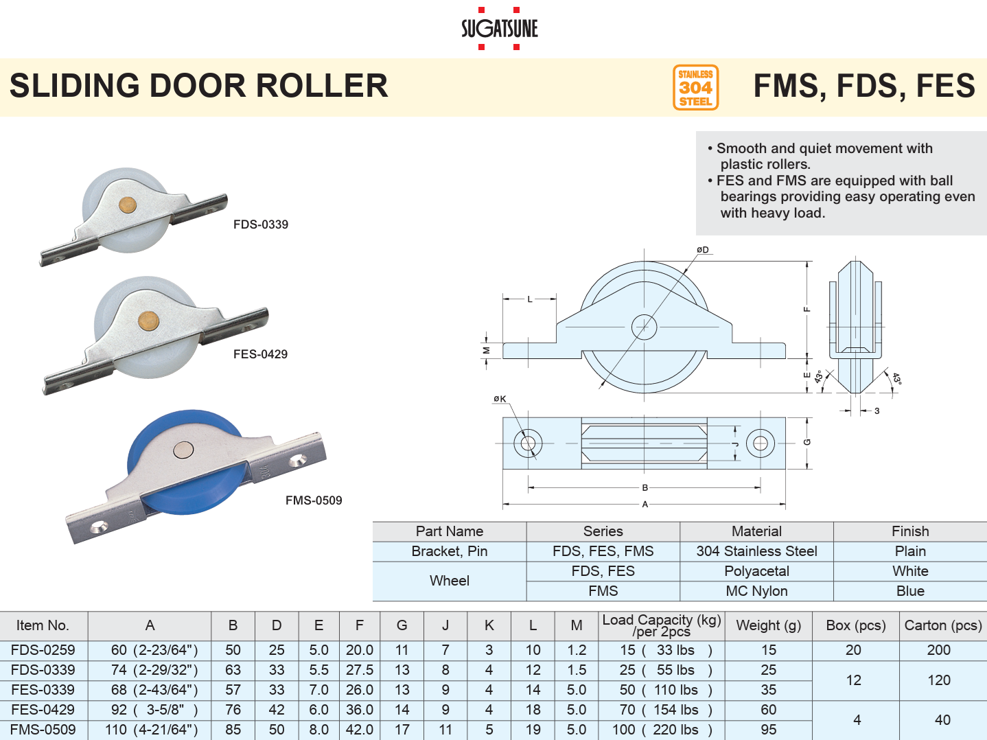 SUGATSUNE FMS, FDS, FES SERIES SLIDING DOOR ROLLERS/SHEAVES