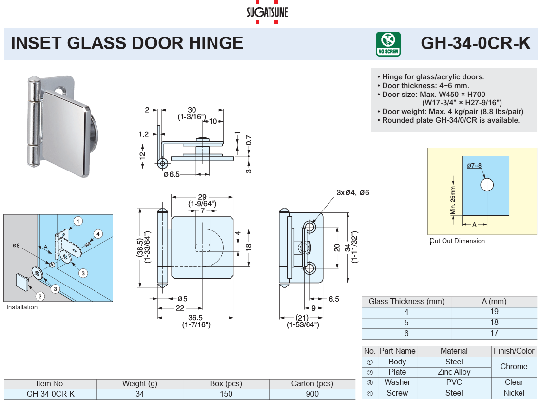 Sugatsune GH-34-0CR-K GLASS DOOR HINGE INSET Square Plate Door Thickness 4-6mm (8.8lb per Pair Max)