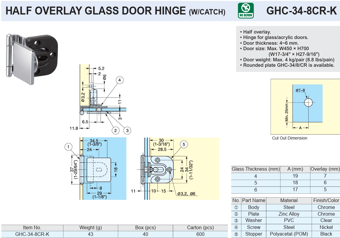 • Door thickness: 4~6 mm.