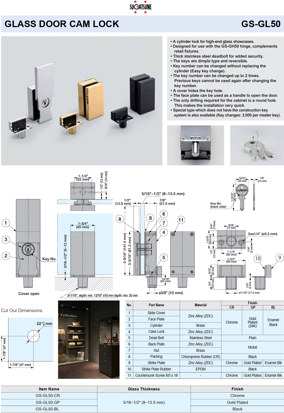 SUGATSUNE GS-GL50 GLASS DOOR CAM LOCK for use with the GS-GH50 hinge