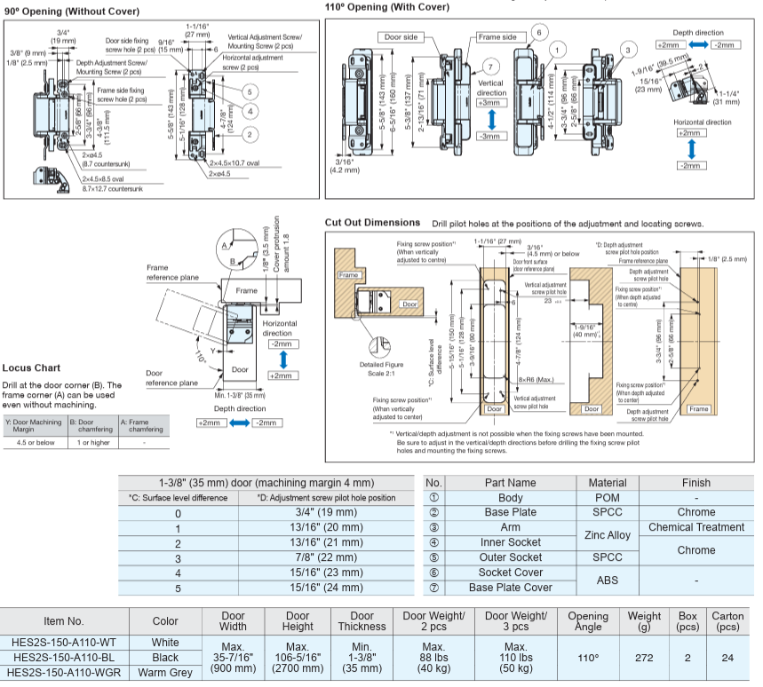 - Opens to 110°. Door stopper is required to prevent breakage of the hinges and failure of the door.