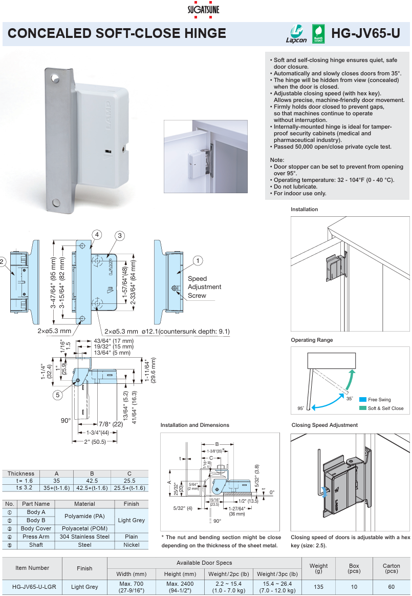 SUGATSUNE HG-JV65-U Soft-Close Hinge (Horizontal Opening)