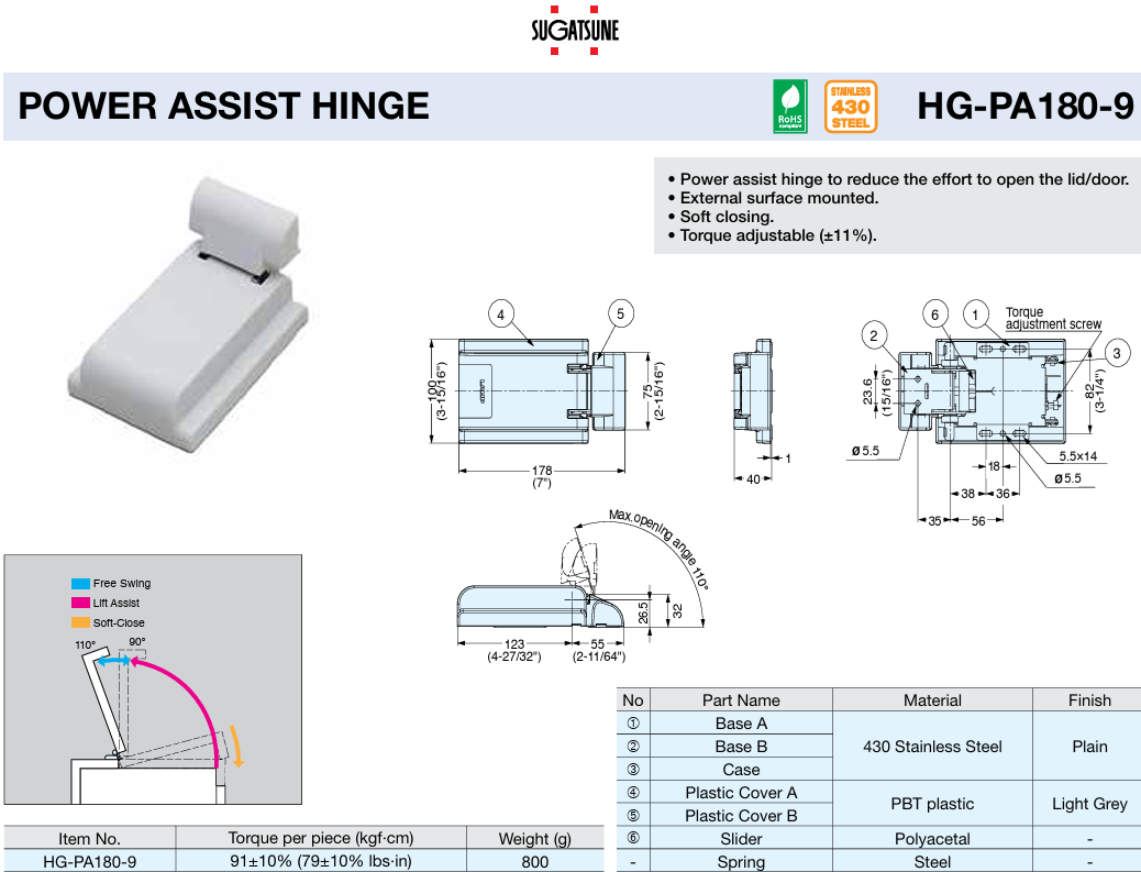 SUGATSUNE HG-PA180-9 Lift Assist Hinge, External Surface Mount