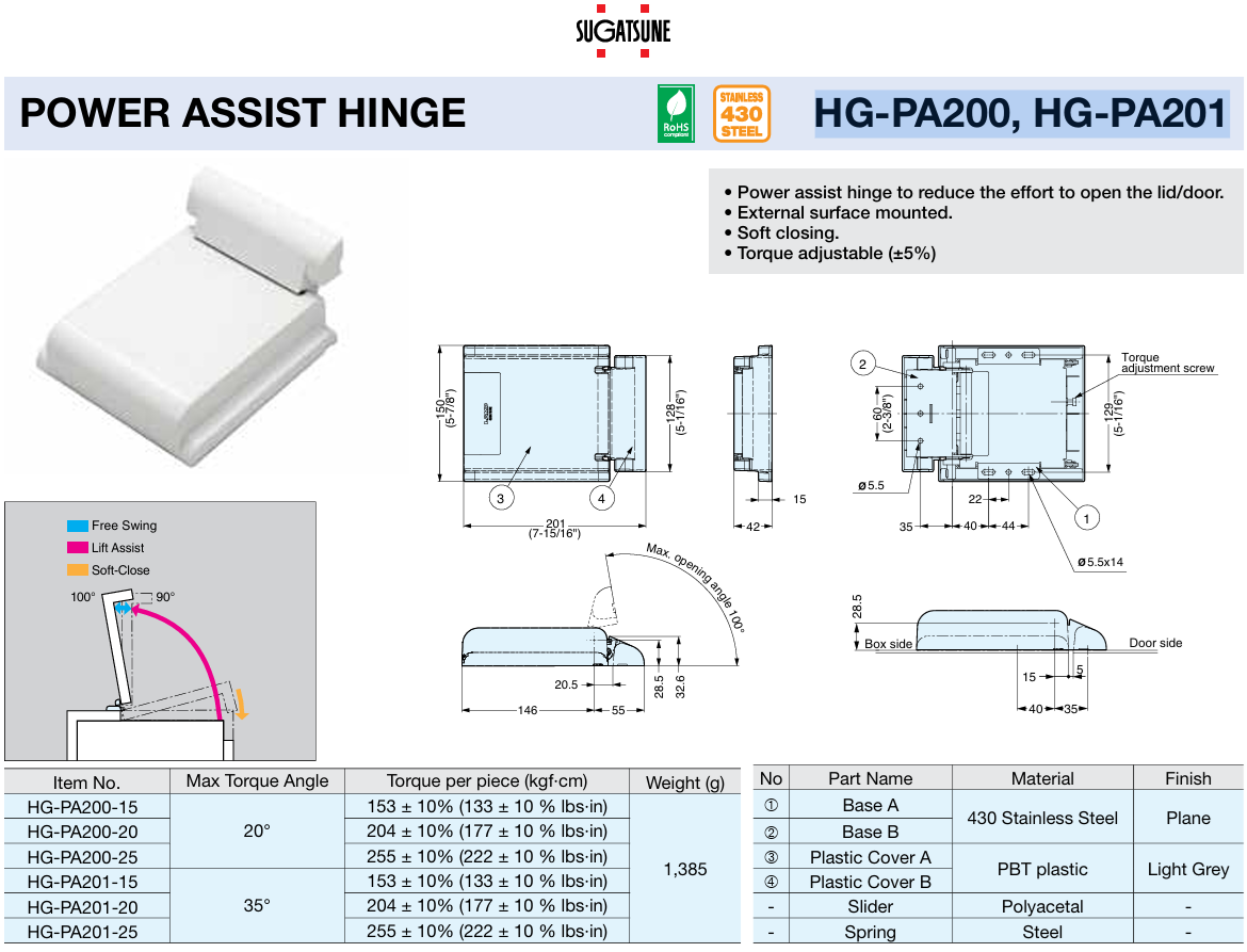 SUGATSUNE HG-PA200 - HG-PA201 POWER ASSIST HINGE 2 TORQUE ANGLES 3 TORQUE OPTIONS