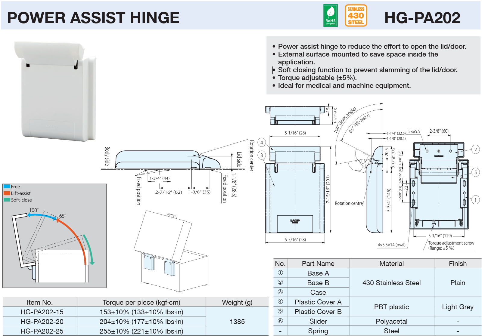SUGATSUNE HG-PA202 POWER ASSIST HINGE EXTERNAL SURFACE MOUNT 3 TORQUE OPTIONS