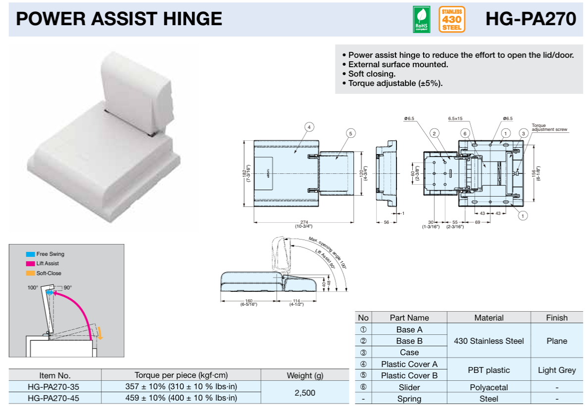 SUGATSUNE HG-PA270 POWER ASSIST HINGE 2 TORQUE OPTIONS