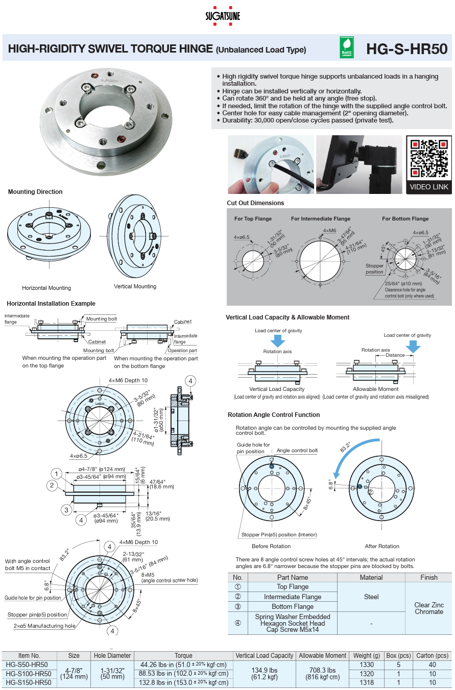 SUGATSUNE HG-S-HR50 HIGH-RIGIDITY SWIVEL TORQUE HINGE (Unbalanced Load Type) 3 Torque Options