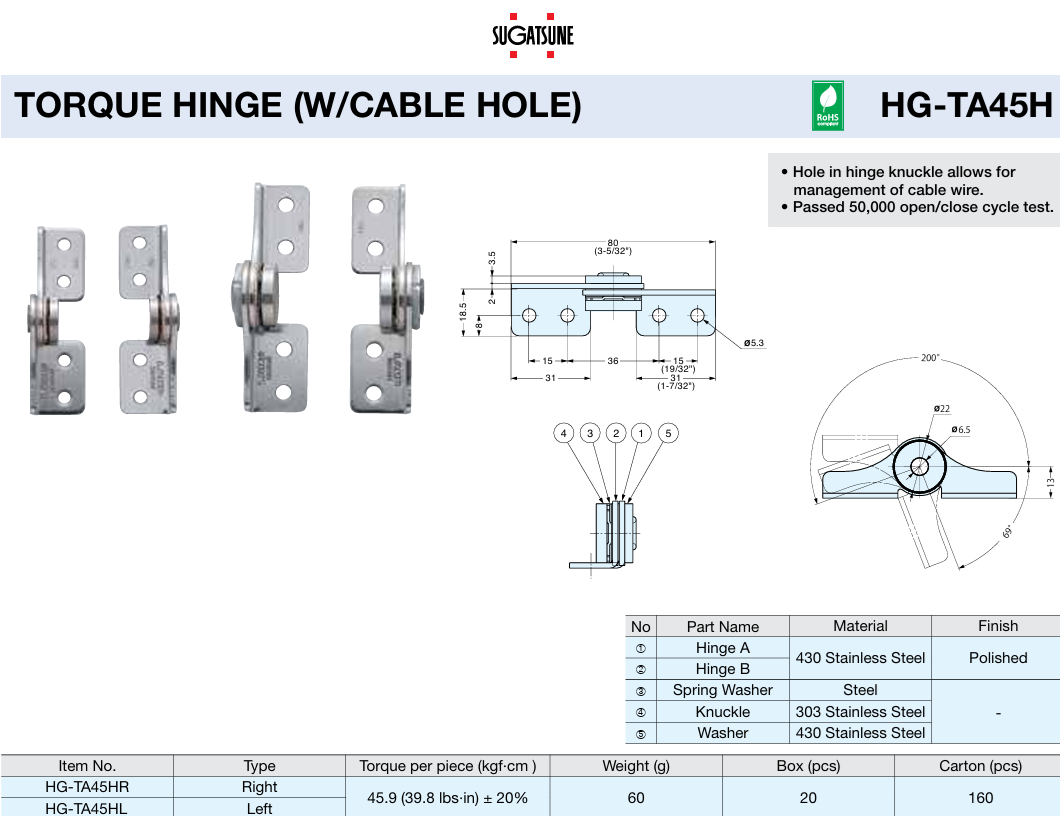SUGATSUNE HG-TA45HL & HG-TA45HR TORQUE HINGE With Wiring Hole