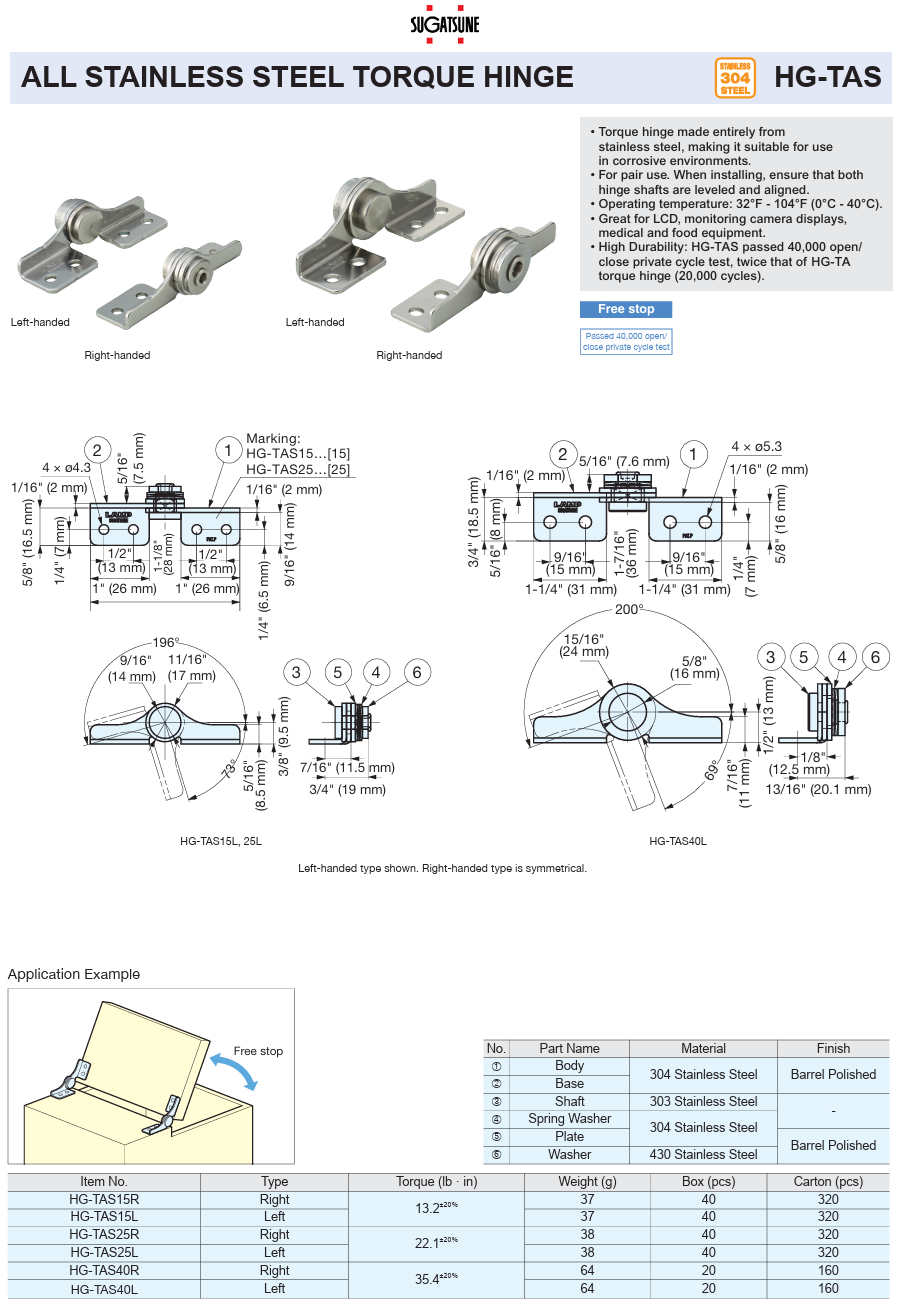 SUGATSUNE HG-TAS Series All Stainless Torque Hinges 3 Sizes and Handed