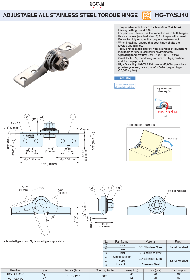 SUGATSUNE HG-TASJ40 Series Adjustable All Stainless Torque Hinges 1 Size,Handed