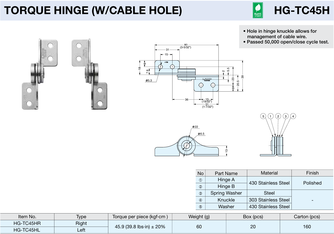 SUGATSUNE HG-TC45HL & HG-TC45HR TORQUE HINGE With Wiring Hole
