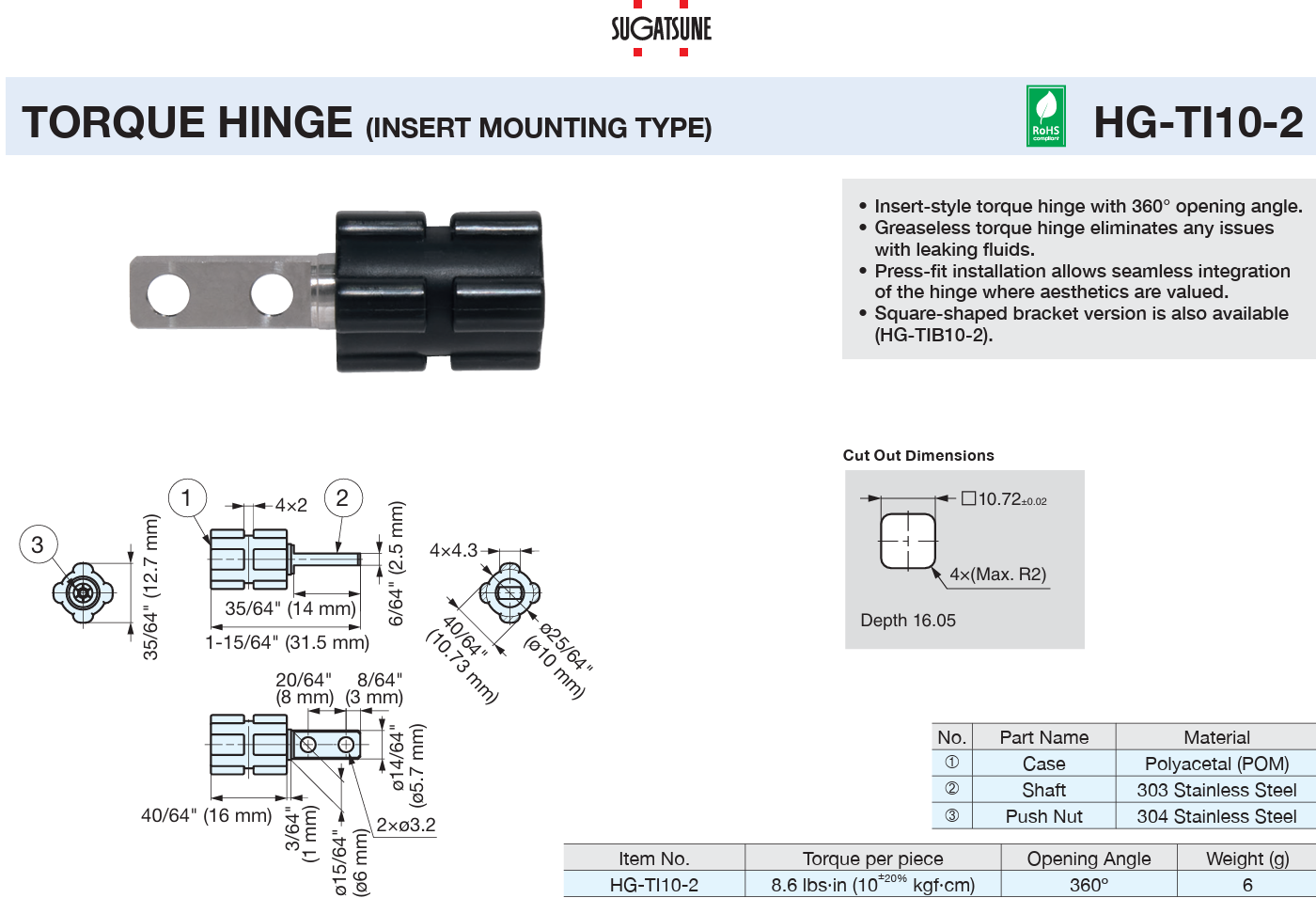 SUGATSUNE HG-TI10-2 TORQUE HINGE (INSERT MOUNTING TYPE)