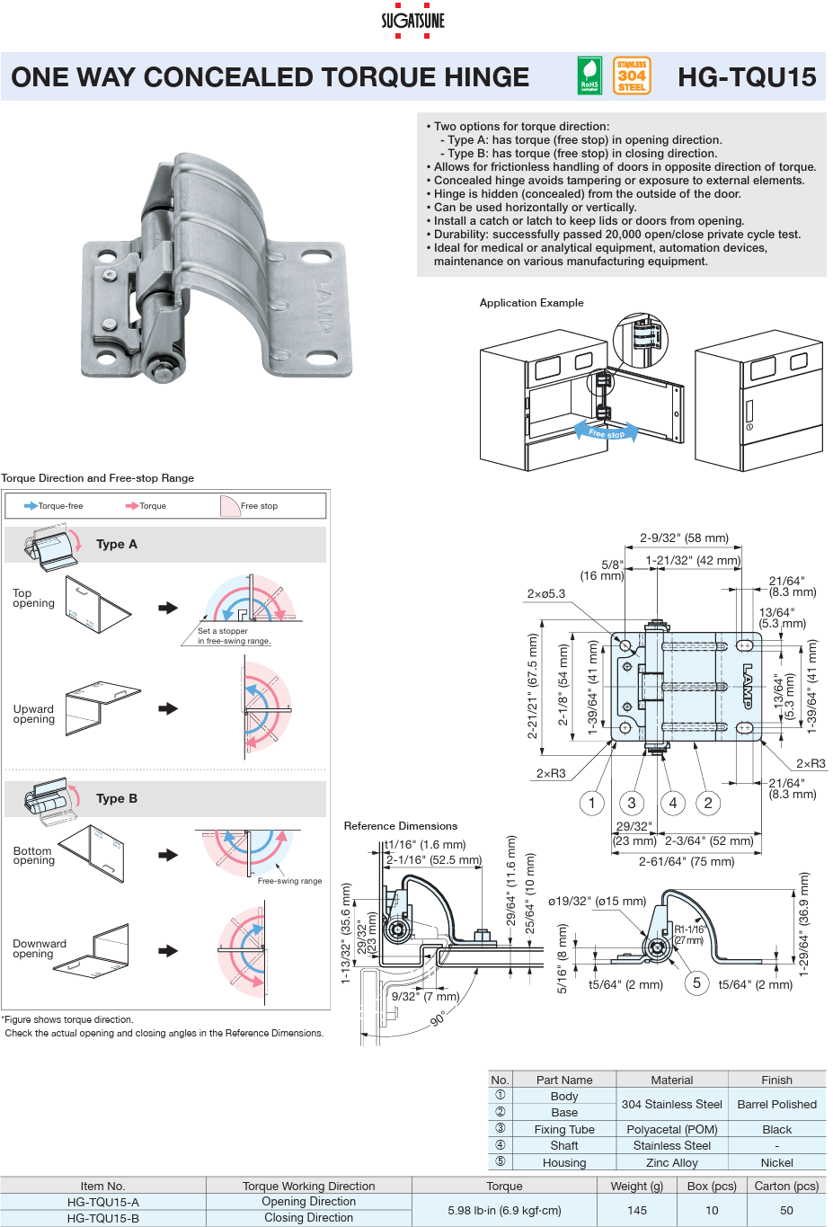 SUGATSUNE HG-TQU15 ONE WAY CONCEALED TORQUE HINGE - Torque option in Opening or Closing Direction