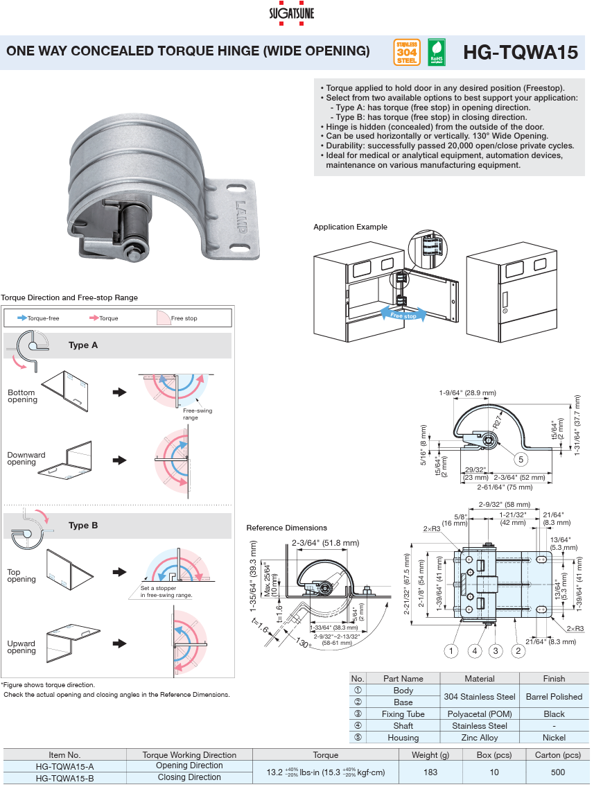SUGATSUNE HG-TQWA15 ONE WAY CONCEALED TORQUE HINGE (WIDE OPENING- Torque option in Opening or Closing Direction