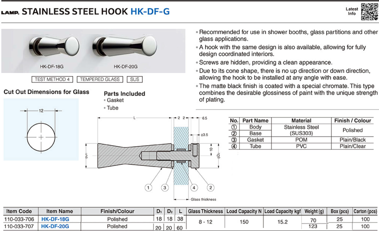 Sugatsune HK-DF-G STAINLESS STEEL HOOK FOR GLASS