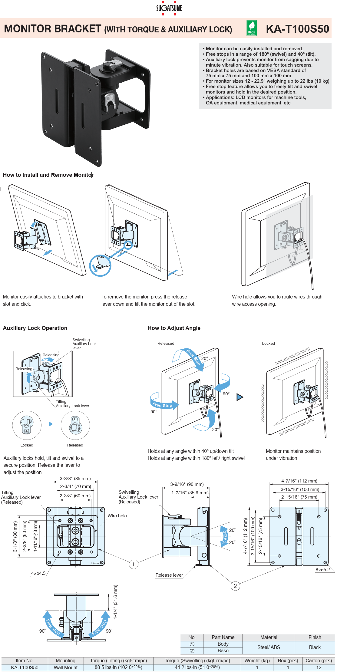 SUGATSUNE KA-T100S50 MONITOR BRACKET (WITH TORQUE & AUXILIARY LOCK)