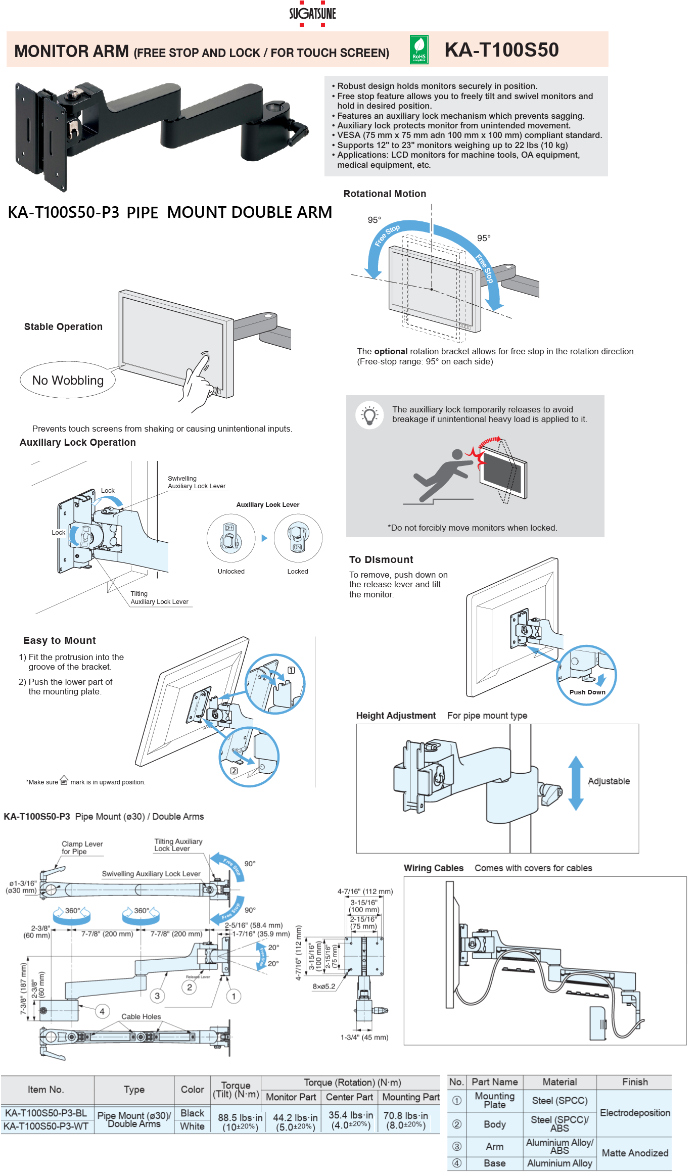 SUGATSUNE KA-T100S50-P3 PIPE MOUNT MONITOR ARM (FREE STOP AND LOCK / FOR TOUCH SCREEN) DOUBLE ARMS PIPE MOUNT
