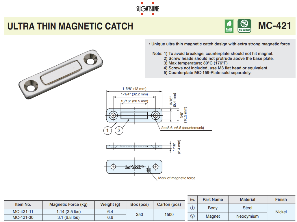Sugatsune MC-421 ULTRA THIN STEEL MAGNETIC CATCH 2 Magnetic Force options