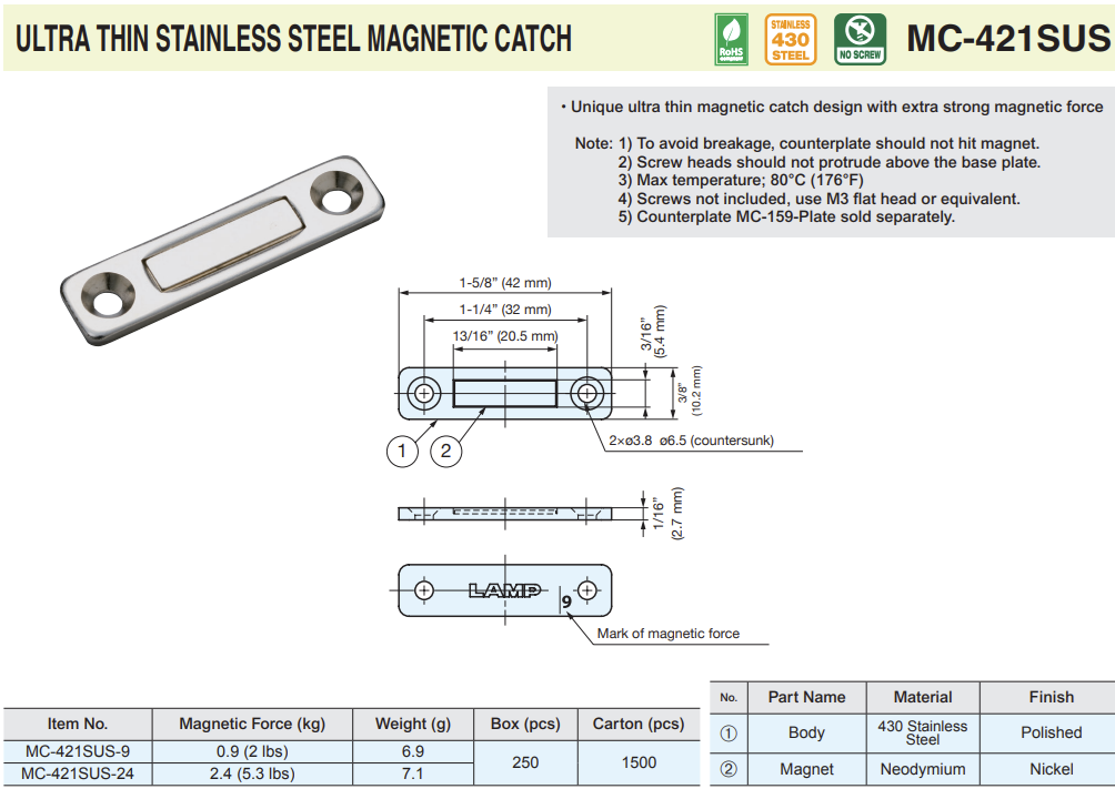 Sugatsune MC-421SUS ULTRA THIN STAINLESS STEEL MAGNETIC CATCH 2 Magnetic Force options