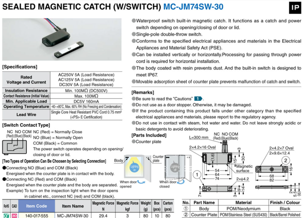 Sugatsune MC-JM74SW-30 Sealed Magnetic Catch (With Switch)