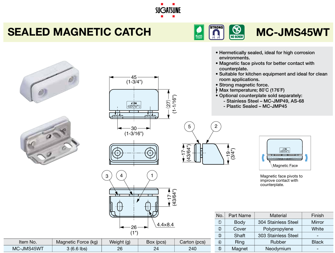 Sugatsune MC-JMS45WT SEALED MAGNETIC CATCH