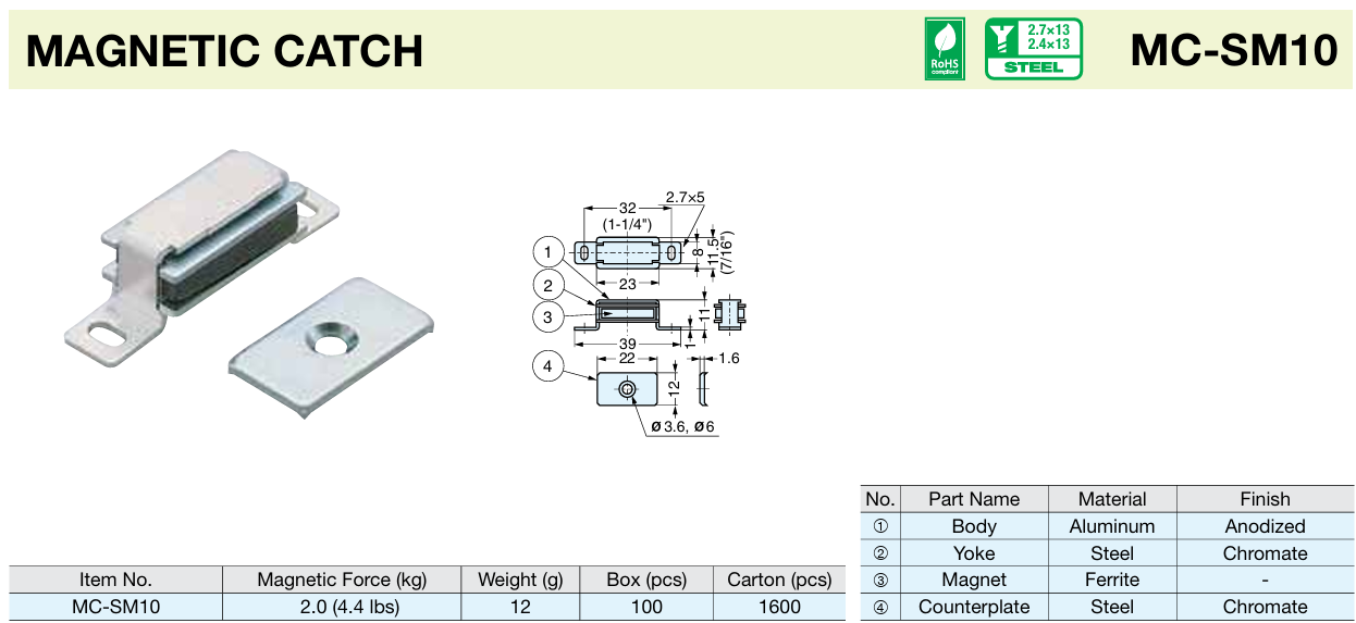 Sugatsune MC-SM10 Magnetic Catch 4.4 Lbs Magnetic Force Anodized Aluminum Body