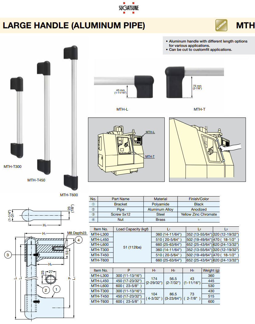 Sugatsune MTH Pipe Handle, Aluminum Grip, Polyamide Brackets 2 Heights and 3 Lengths