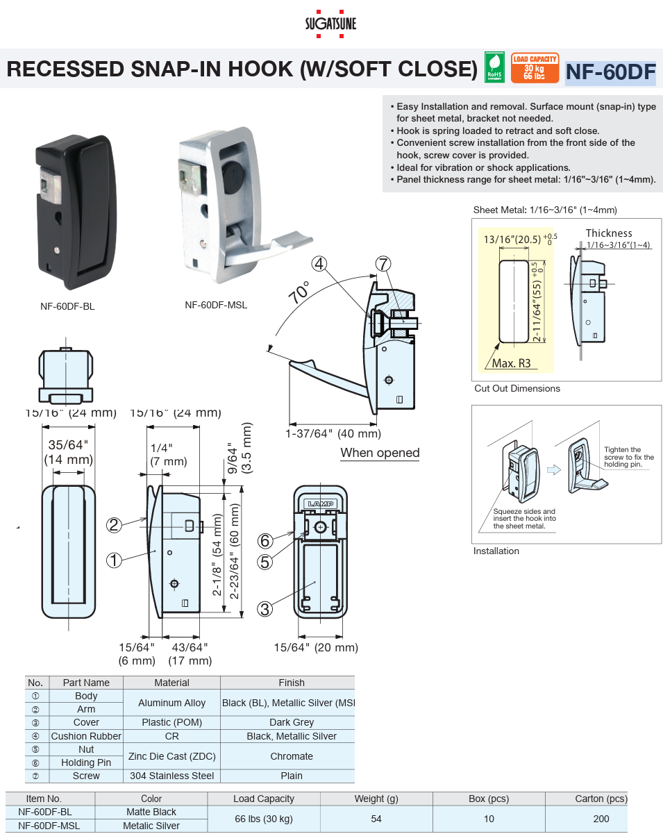 Sugatsune NF-60DF RECESSED Retractable Snap-In Hook With Damper