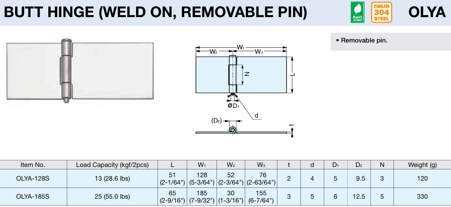 Sugatsune OLYA Series STAINLESS STEEL BUTT Hinge - Weld On with a removeable Pin
