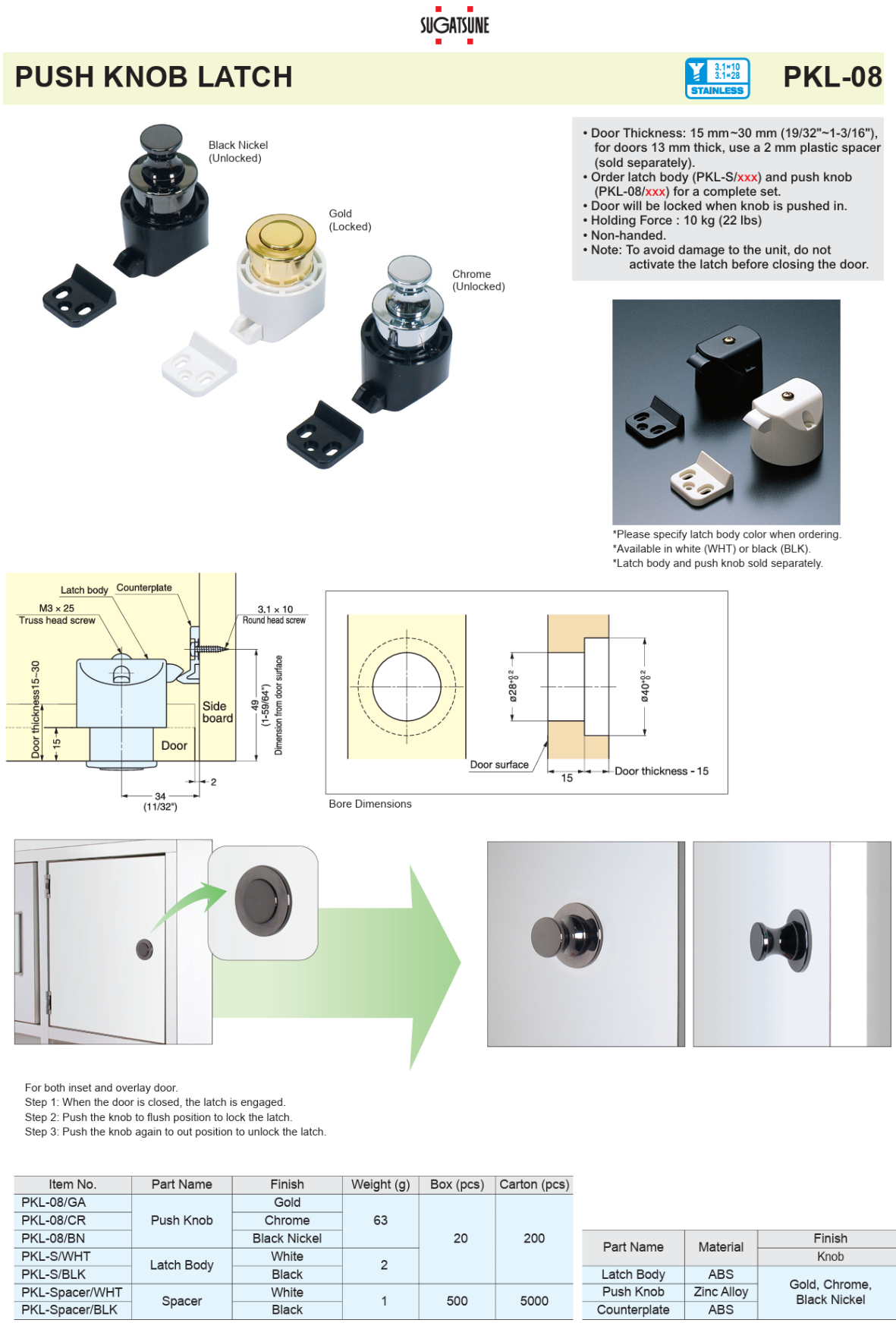 • Order latch body (PKL-S/xxx) and push knob (PKL-08/xxx) for a complete set.