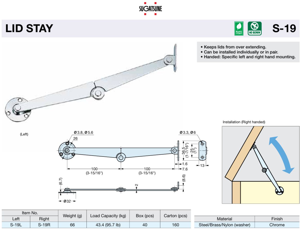 Sugatsune S-19 LID STAYS LEFT AND RIGHT HANDED