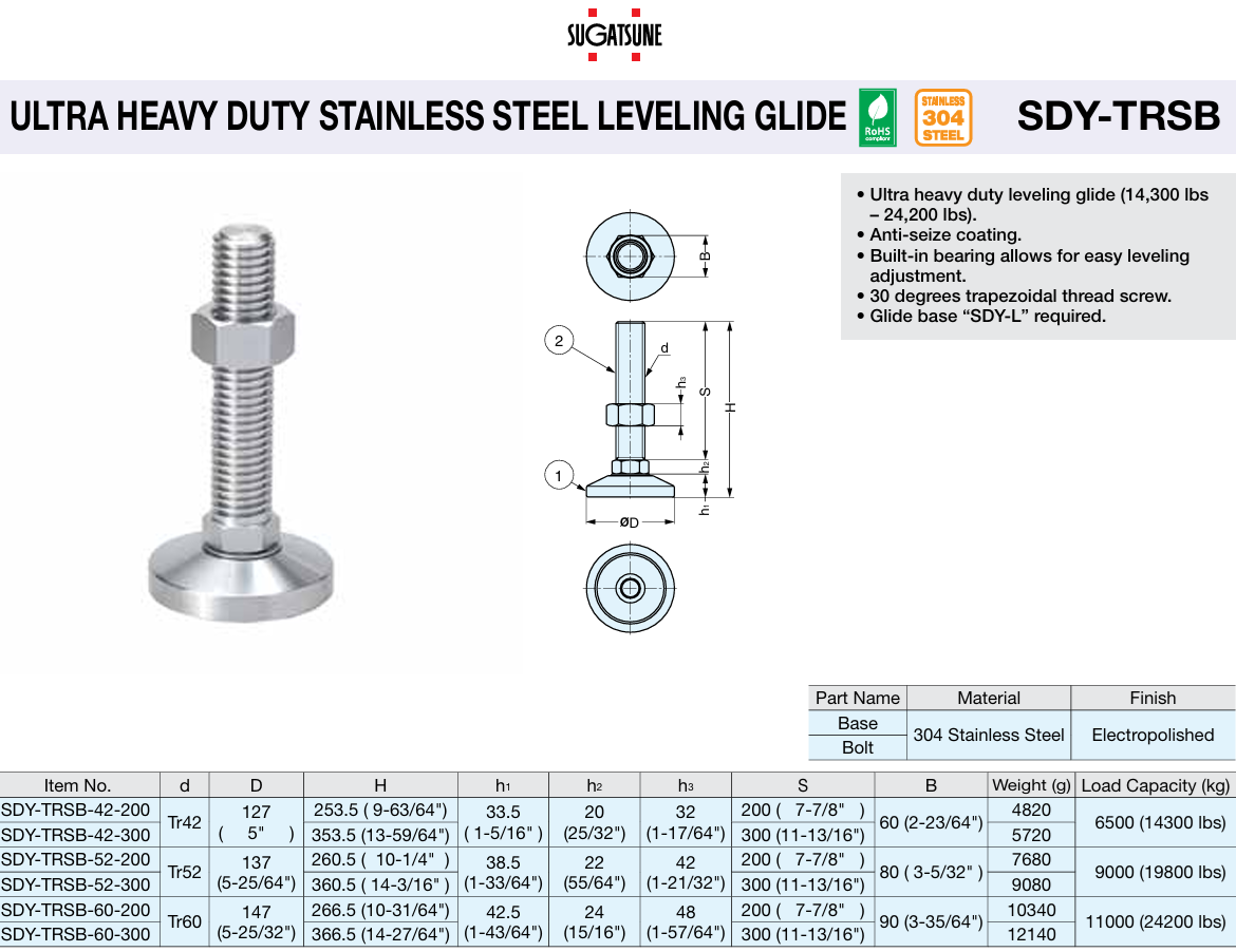 Sugatsune SDY-TRSB ULTRA HEAVY DUTY STAINLESS STEEL LEVELING GLIDE